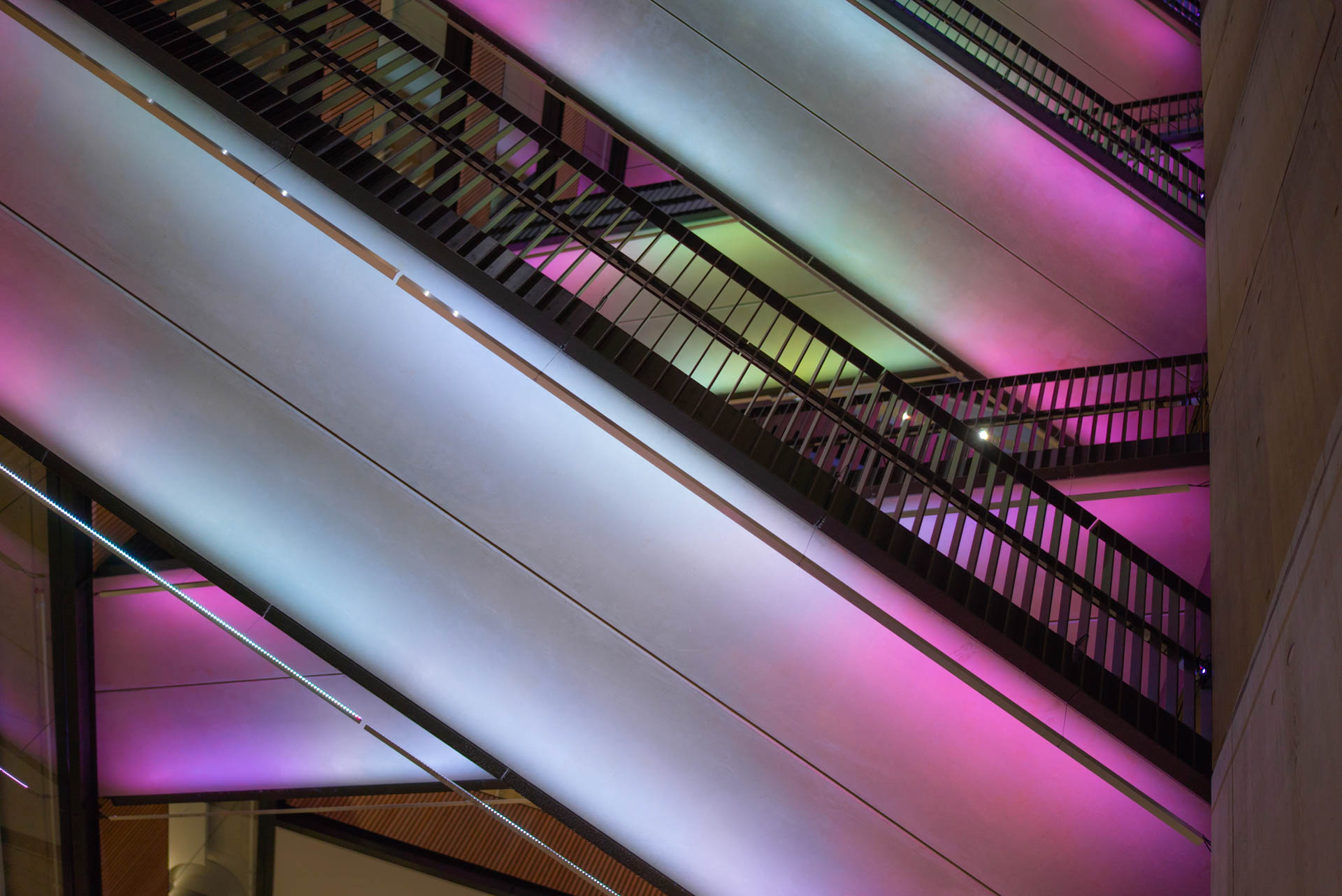 Observe your impact on the space as each interaction creates a “trace”, dynamically shaping the environment in real time. Sensors (within the Beacons on the ground floor) capture the subtlety of your individual presence, blending it with the collective flow and density to create a shared experience. Colour and gradients throughout the entire installation softly illuminate and intensify, reflecting the energy of the space and supporting the Television Centre’s identity as a "creative hub" of human and architectural connection.